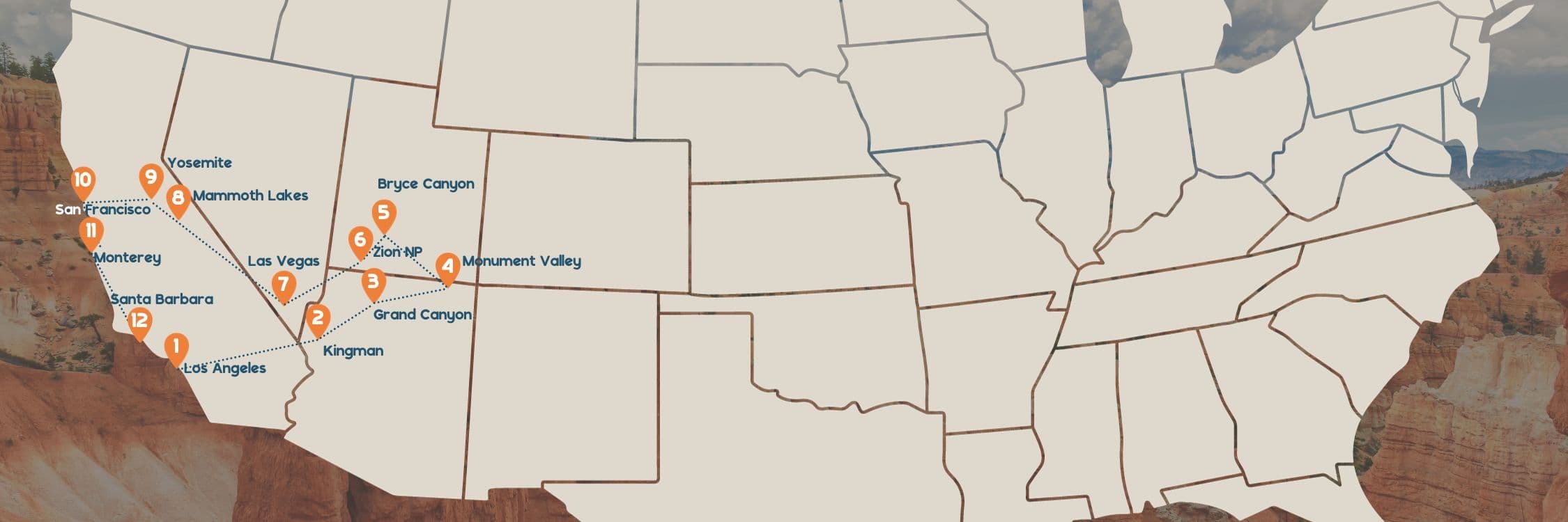 Los Angeles – Kingman – Grand Canyon – Monument Valley – Zion – Bryce Canyon – Las Vegas – Mammoth Lakes – Yosemite – San Francisco – Monterey – Santa Barbara