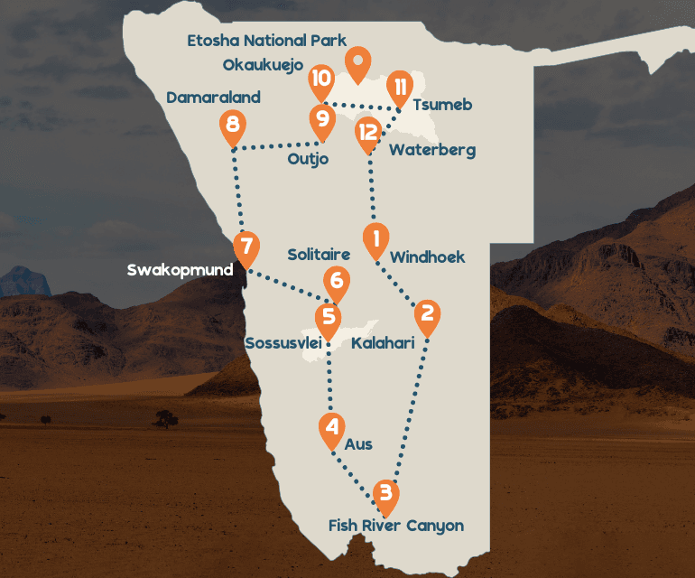 Windhoek - Kalahari - Fish River Canyon - Aus - Sossusvlei - Solitaire - Swakopmund - Damaraland - Outjo - Okaukuejo - Tsumeb - Waterberg