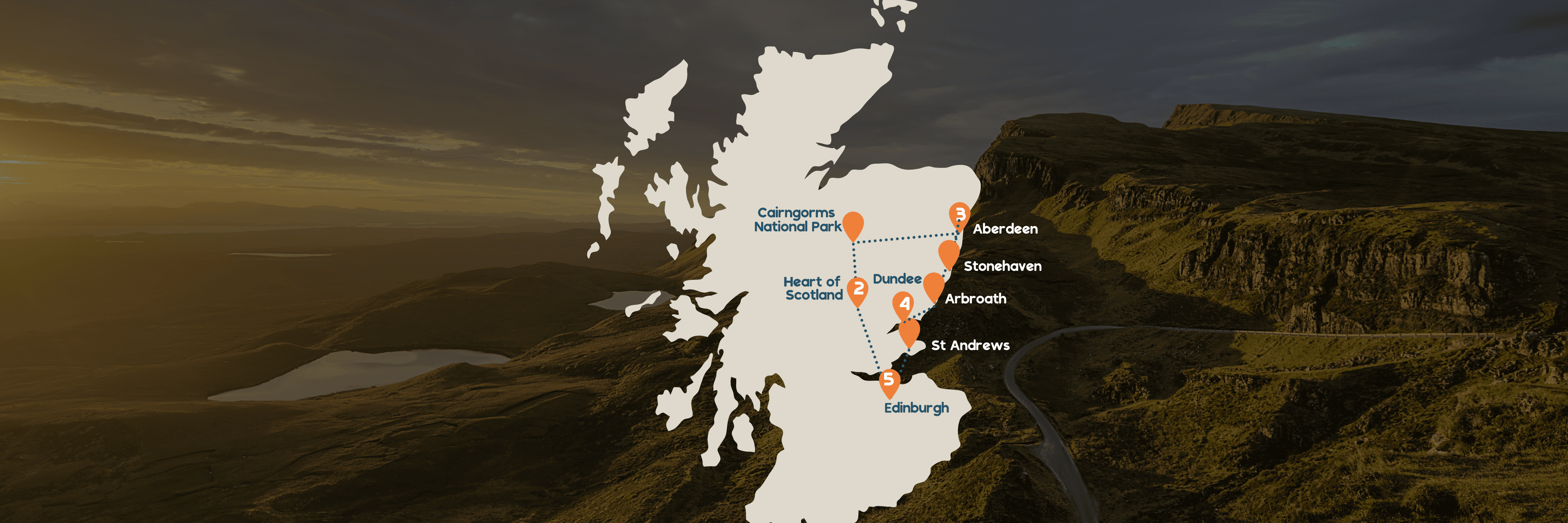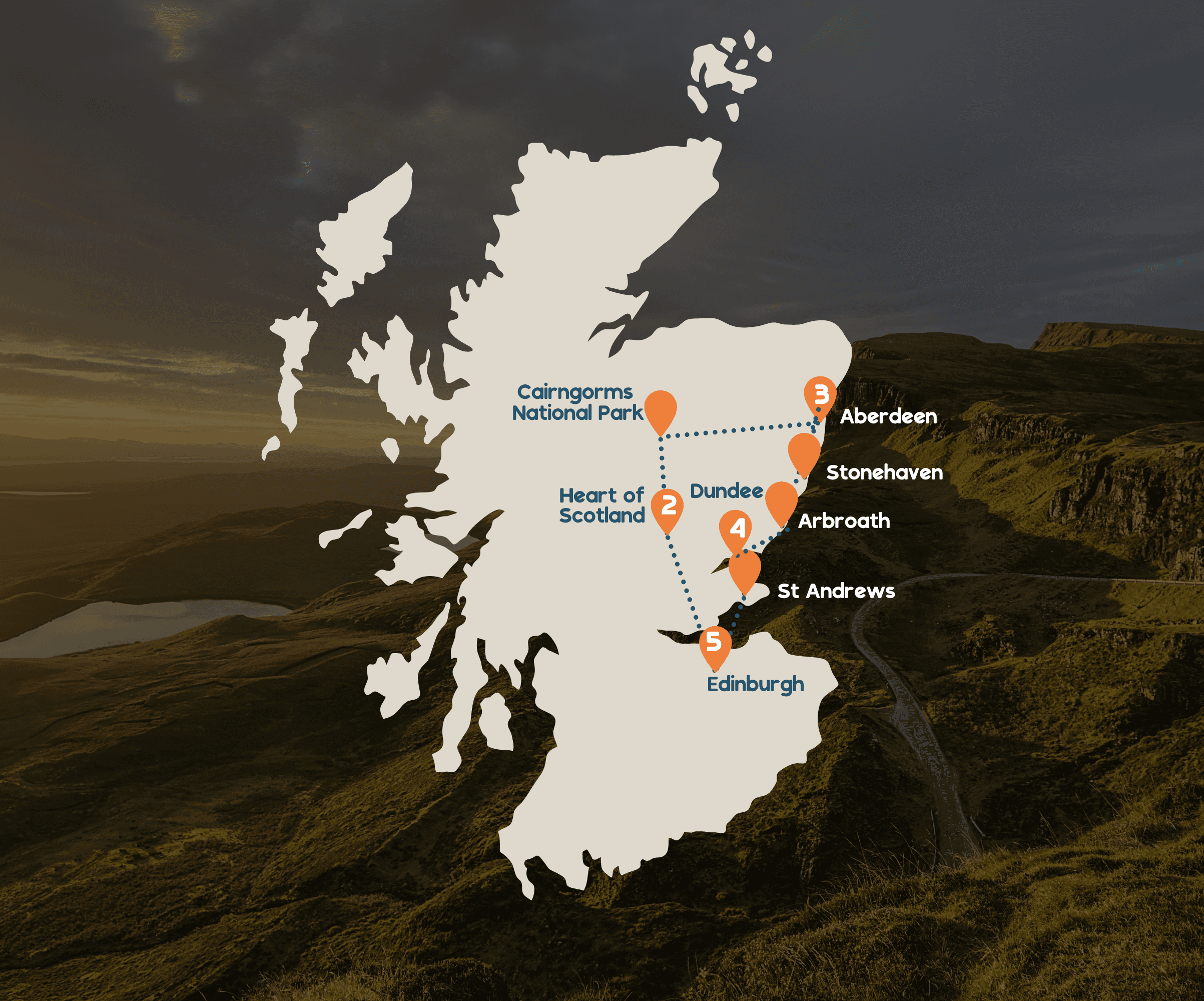 Verken het Cairngorms National Park met zijn prachtige bergen en wilde natuur. Bezoek Aberdeen met zijn granieten architectuur, het kustplaatsje Stonehaven en het historische Arbroath. Ontdek de moderne stad Dundee en het beroemde St. Andrews. Eindig je avontuur weer in Edinburgh voordat je terugkeert naar Newcastle voor de ferry naar huis.